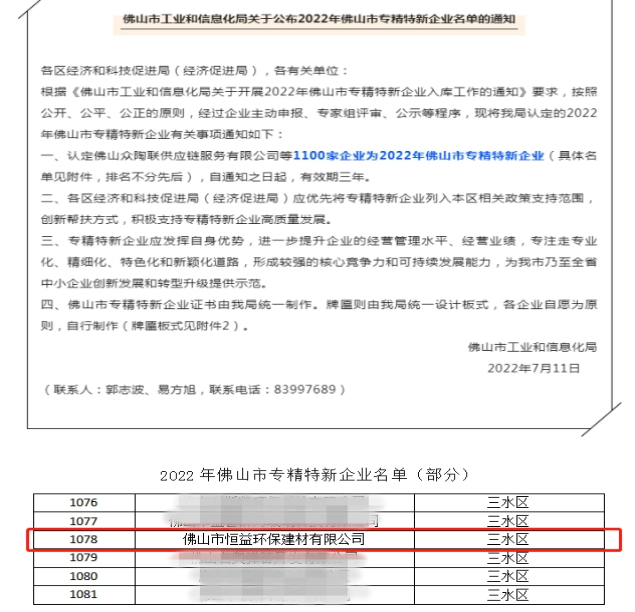近日,佛山市工業(yè)和信息化局公布“2022年佛山市專精特新企業(yè)擬入庫(kù)名單”,佛山市恒益環(huán)保建材有限公司憑借在加氣塊行業(yè)領(lǐng)域“創(chuàng)新、專注、精進(jìn)”的突出表現(xiàn)成功上榜,喜獲2022年佛山市“專精特新”企業(yè)榮譽(yù)。