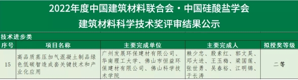 近日,“2022年度中國(guó)建筑材料聯(lián)合會(huì)?中國(guó)硅酸鹽學(xué)會(huì)建筑材料科學(xué)技術(shù)獎(jiǎng)”公示了評(píng)審結(jié)果,恒益環(huán)保建材公司與廣州發(fā)展環(huán)保建材、華南理工大學(xué)、佛山科學(xué)技術(shù)學(xué)院共同參與完成的《高品質(zhì)蒸壓加氣混凝土制品綠色低碳智造成套關(guān)鍵技術(shù)和產(chǎn)業(yè)化應(yīng)用》項(xiàng)目榮獲建筑材料科學(xué)技術(shù)獎(jiǎng)技術(shù)進(jìn)步類二等獎(jiǎng)!