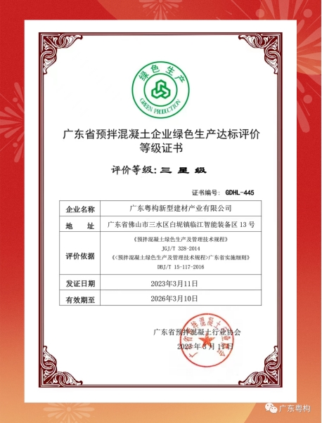 3月11日,經(jīng)廣東省預拌混凝土行業(yè)協(xié)會、佛山市住房和城鄉(xiāng)建設局及佛山市建筑業(yè)協(xié)會專家組現(xiàn)場考察審定通過,廣東粵構新型建材產(chǎn)業(yè)有限公司正式評定為“綠色生產(chǎn)三星級達標企業(yè)”,頒發(fā)《廣東省預拌混凝土企業(yè)綠色生產(chǎn)達標評價等級證書》。