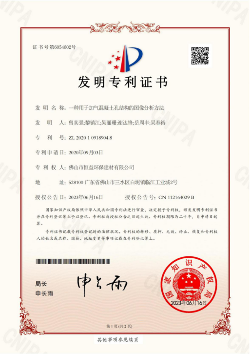 近日,從國家知識產(chǎn)權(quán)局傳來喜訊,恒益環(huán)保建材申報的“一種用于加氣混凝土孔結(jié)構(gòu)的圖像分析方法”獲得國家知識產(chǎn)權(quán)局頒發(fā)的發(fā)明專利證書。